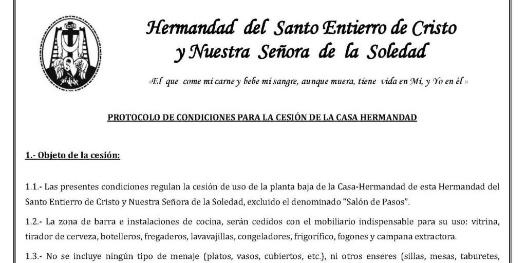 La Hermandad de la Soledad, pone a disposición de cualquier persona (Hermano o no) o entidad, para una fecha concreta y determinada; excepto para el periodo de Comuniones, donde se aceptarán preinscripciones sin fecha de celebración determinada el uso de la planta baja de la Casa-Hermandad de esta Hermandad del Santo Entierro de Cristo y Nuestra Señora de la Soledad, excluido el denominado ‘Salón de Pasos’. Para ello, existe un protocolo de condiciones, para dicha cesión, que se acompaña, con la siguiente publicación.